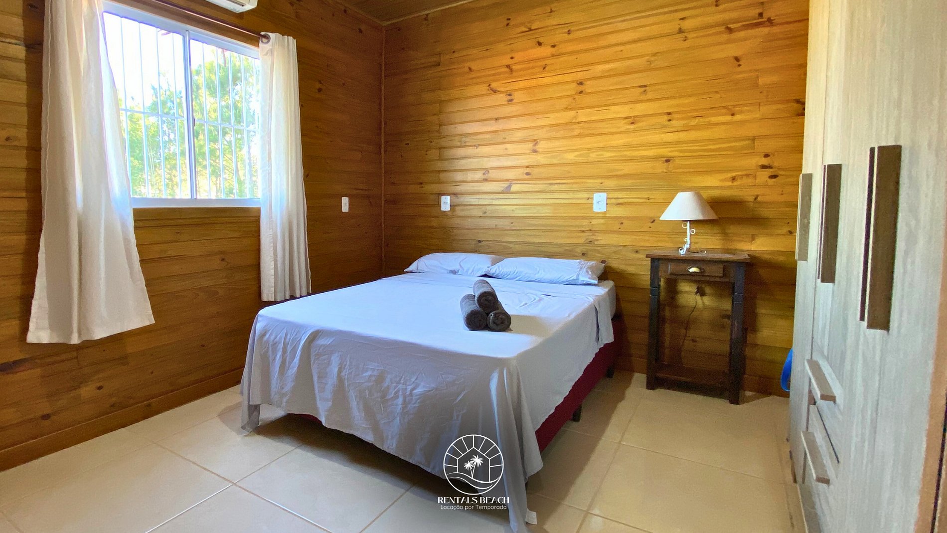 Quarto 01: Cama de casal, armário com portas para roupas, ar condicionado.