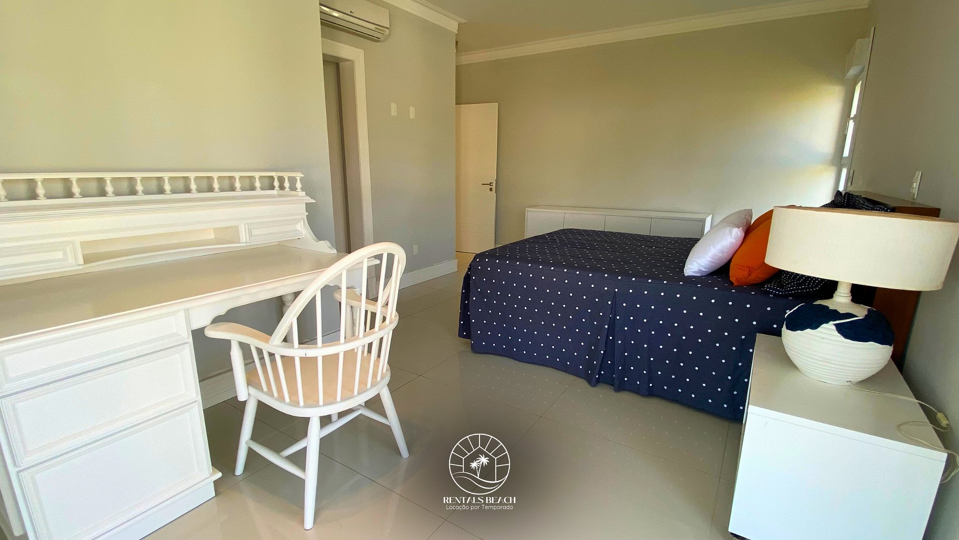 Suíte 03: 01 cama de casal queem, mesa de apoio ao lado da cama, ar condicionado, mesa para trabalho, smart TV, armário com espelho.