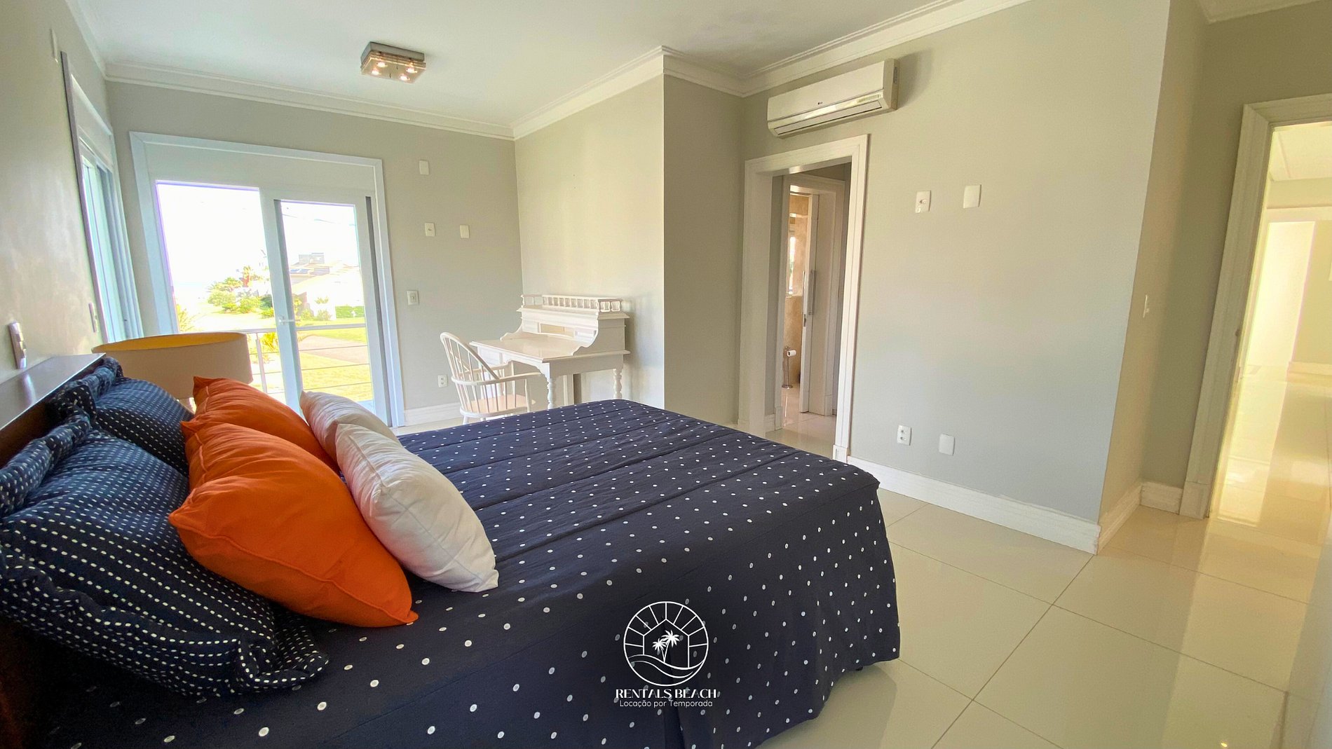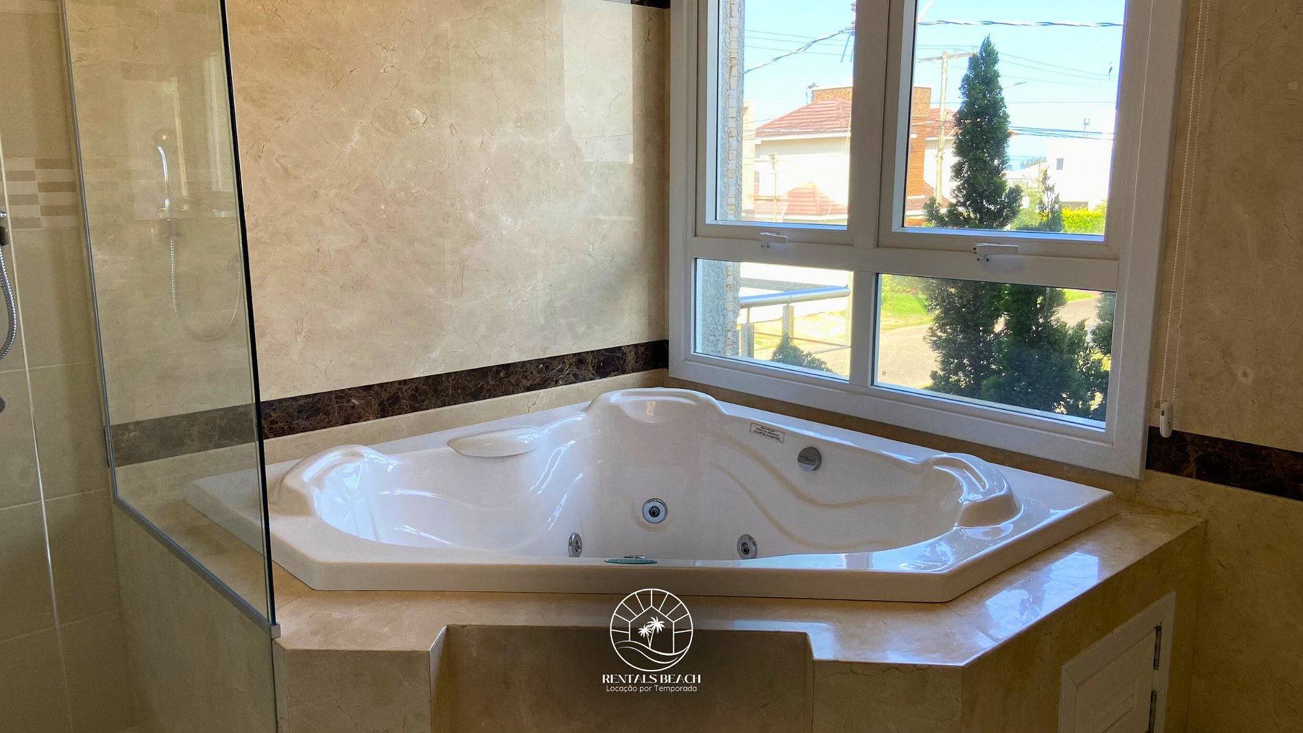 Suíte Master: 01 cama de casal queem, mesa de apoio ao lado da cama, ar condicionado, smart TV, clouset, varanda e banheiro completo com banheira Jacuzzi.