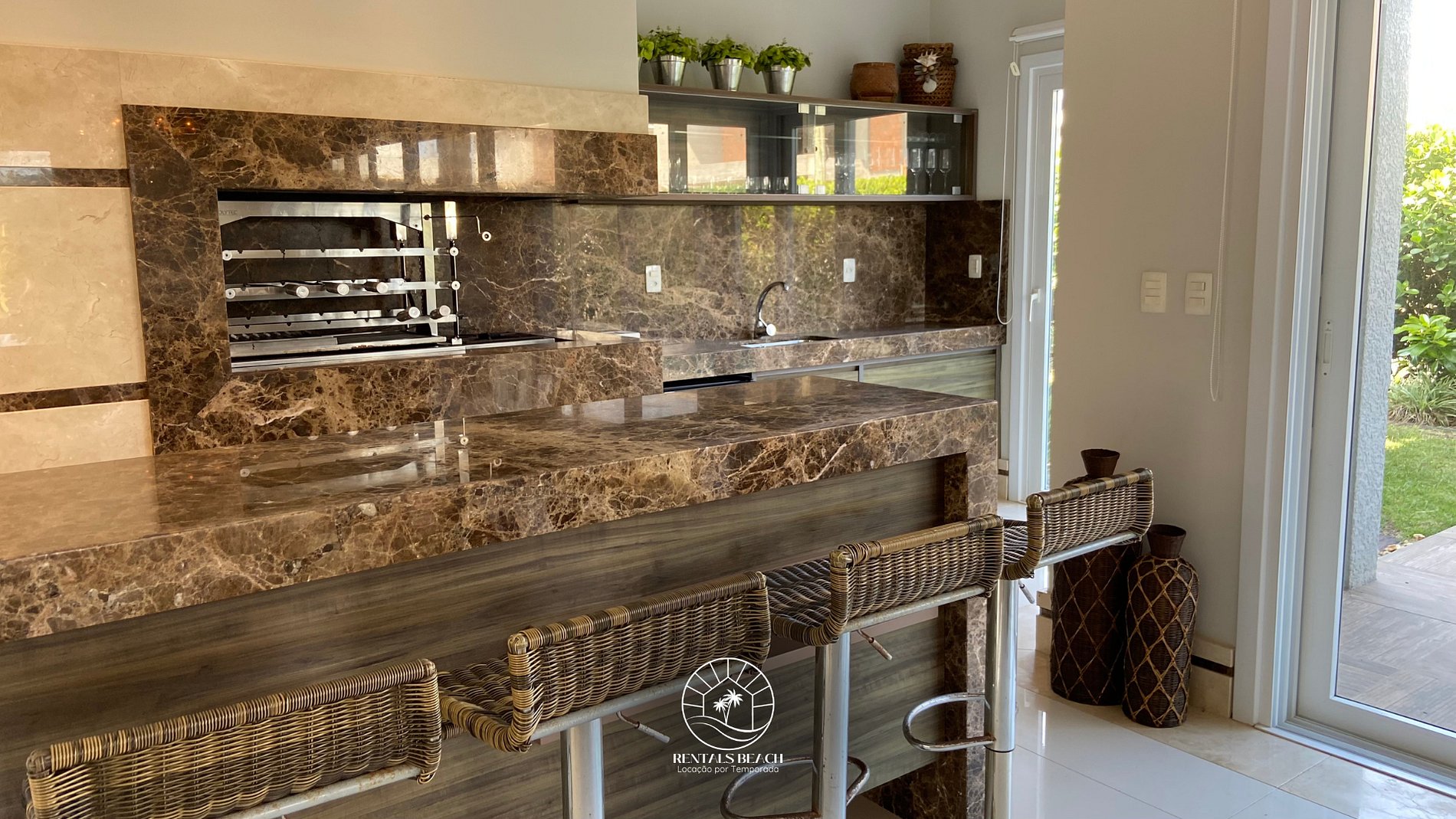 Área Goumet: churrasqueira com todos os utensílios, pia, taças, copos, talheres, bancada de mármore com 04 cadeiras altas e cervejeira.