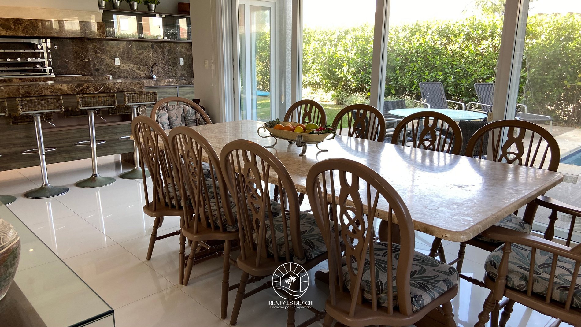Sala de jantar: mesa de mármore com 10 cadeiras.