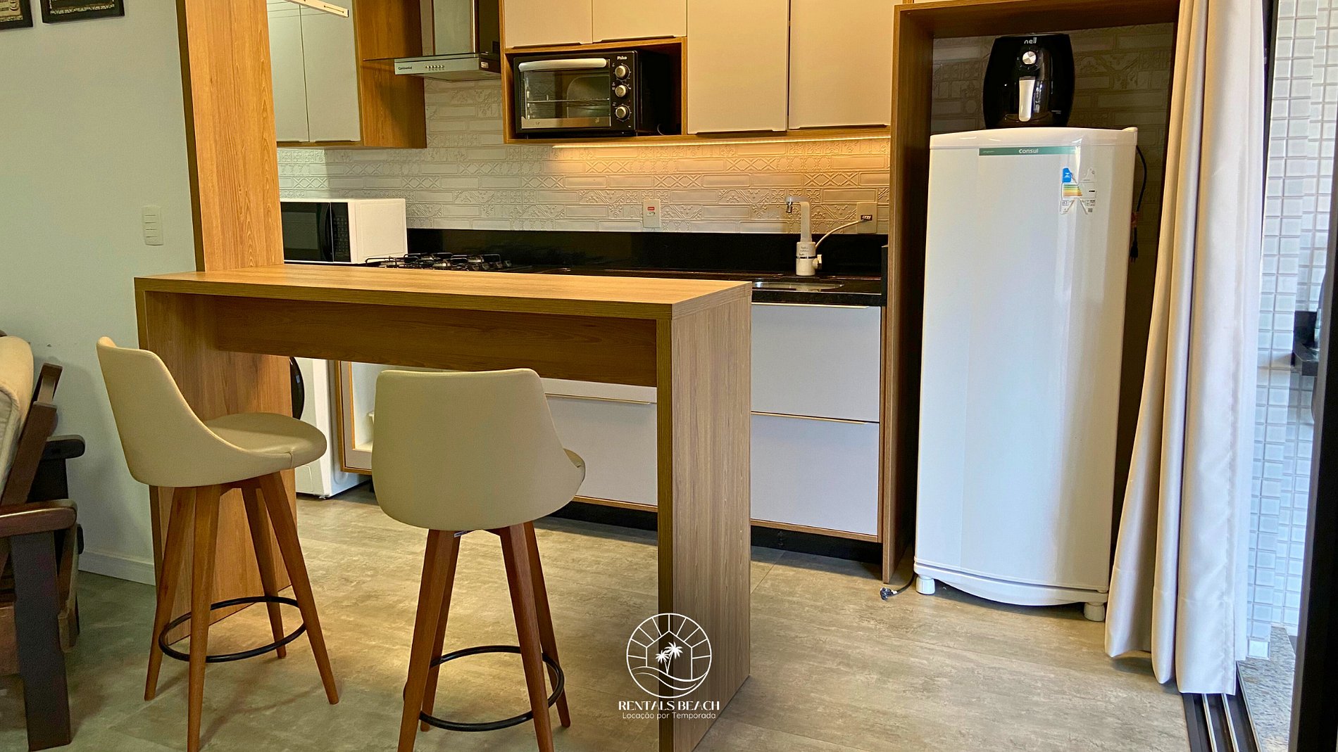 Cozinha: fogão 4 bocas, geladeira, forno, micro-ondas, chaleira elétrica, liquidificador, cafeteira, utensílios, máquina de lavar.