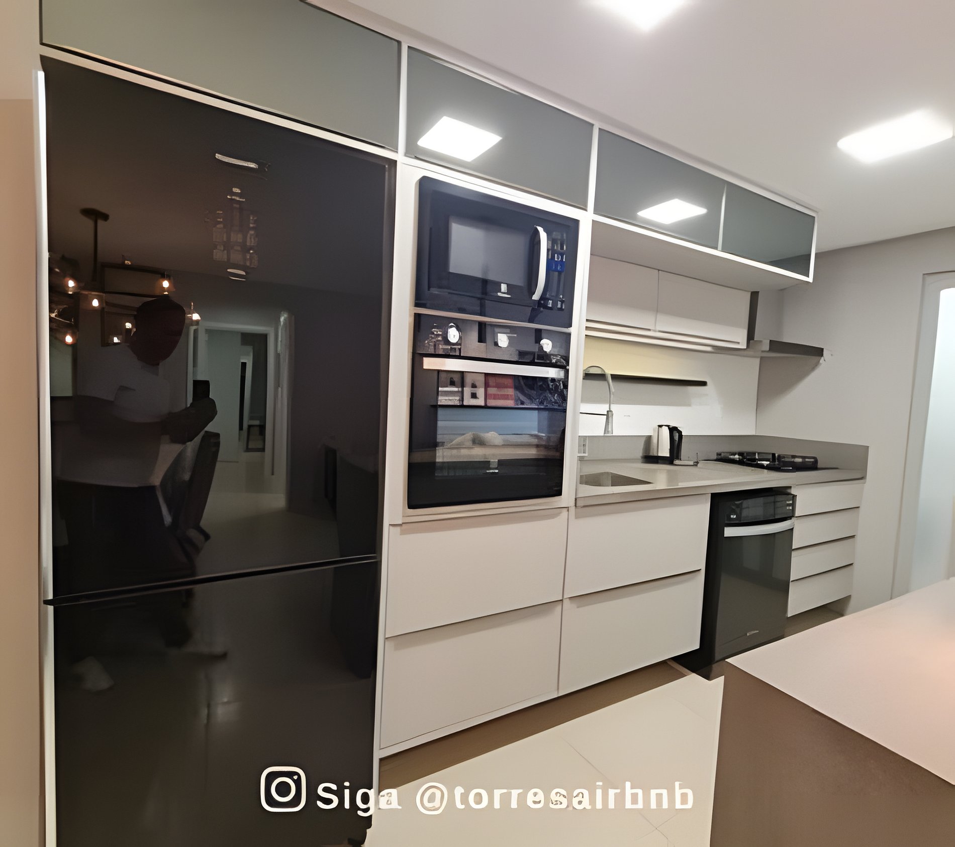 Cozinha: fogão 4 bocas, geladeira, forno, micro-ondas, lava louças, chaleira elétrica, sanduicheira e utensílios.
