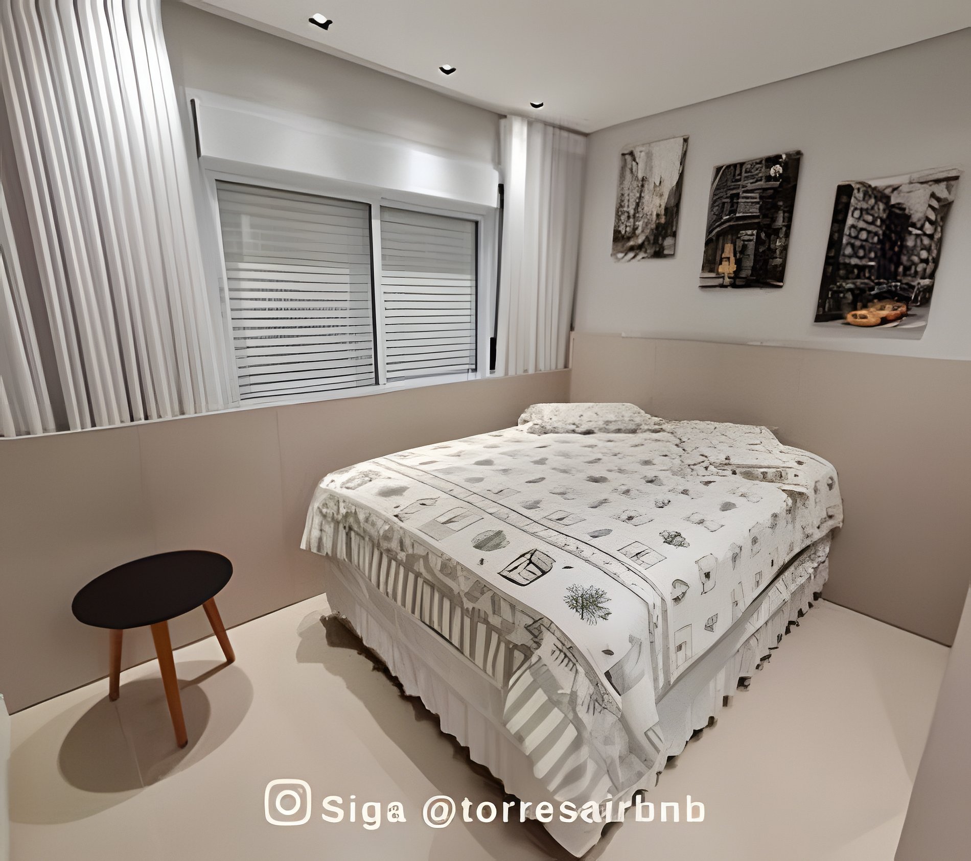 Quarto principal: cama King, ar-condicionado, armário fechado com cabides, espelho, banheiro privativo e cortina blackout.