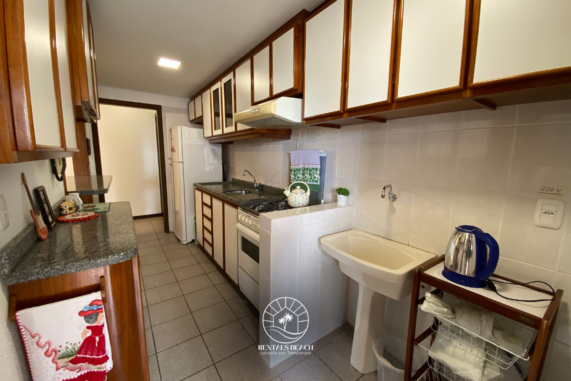 Cozinha: fogão 4 bocas, geladeira, forno, micro-ondas, chaleira elétrica, cafeteira, sanduicheira e utensílios.