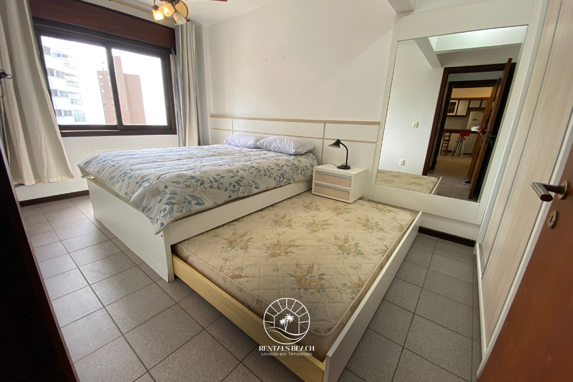 Quarto 01: cama de casal padrão, cama de casal auxiliar, ventilador de teto, armário fechado com cabides, espelho e cortina blackout.