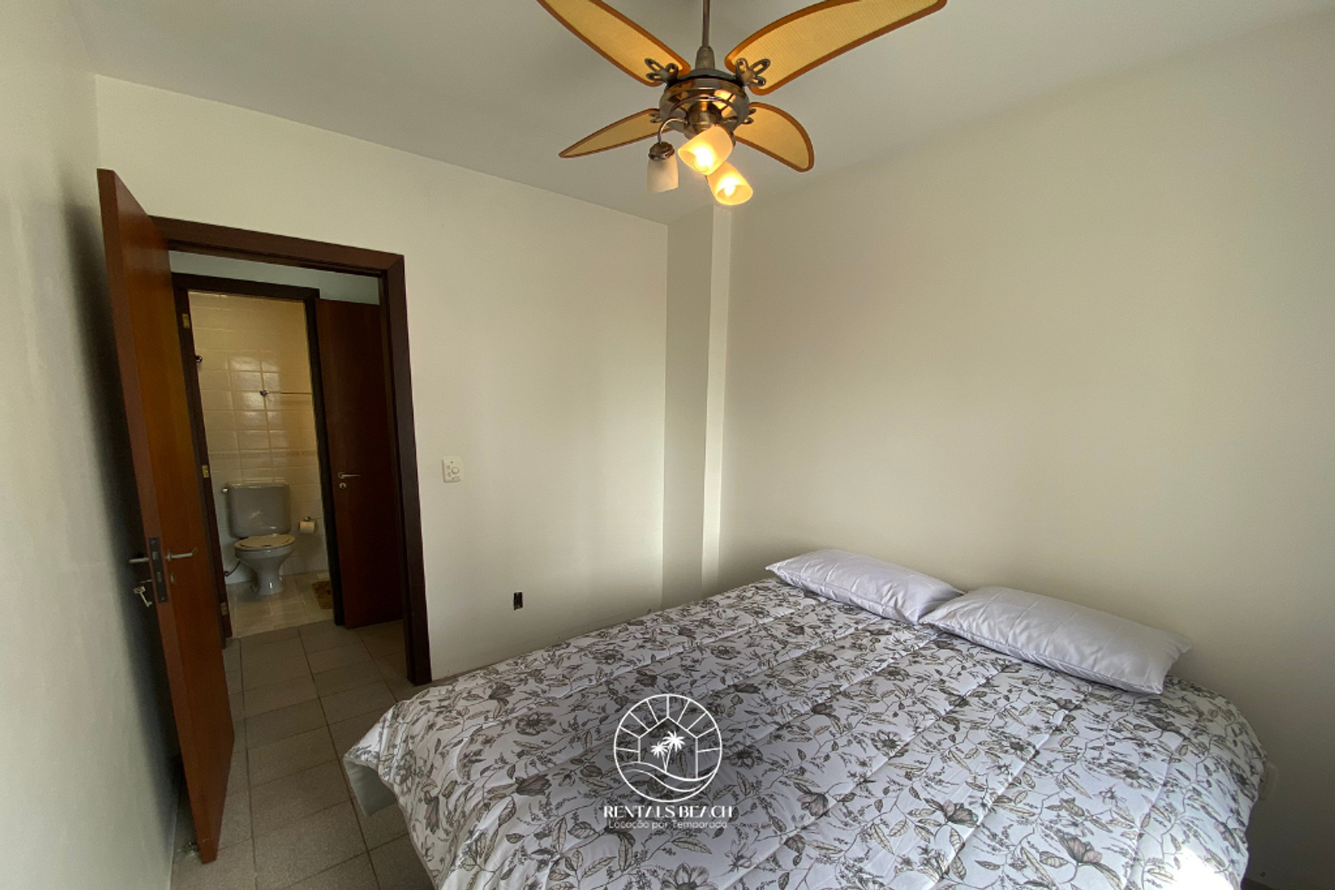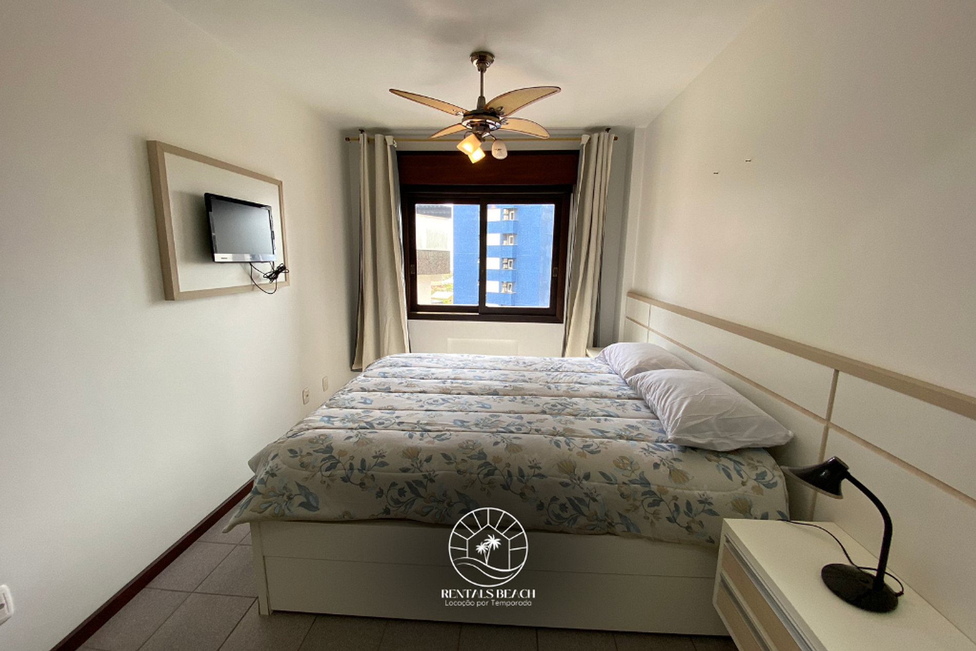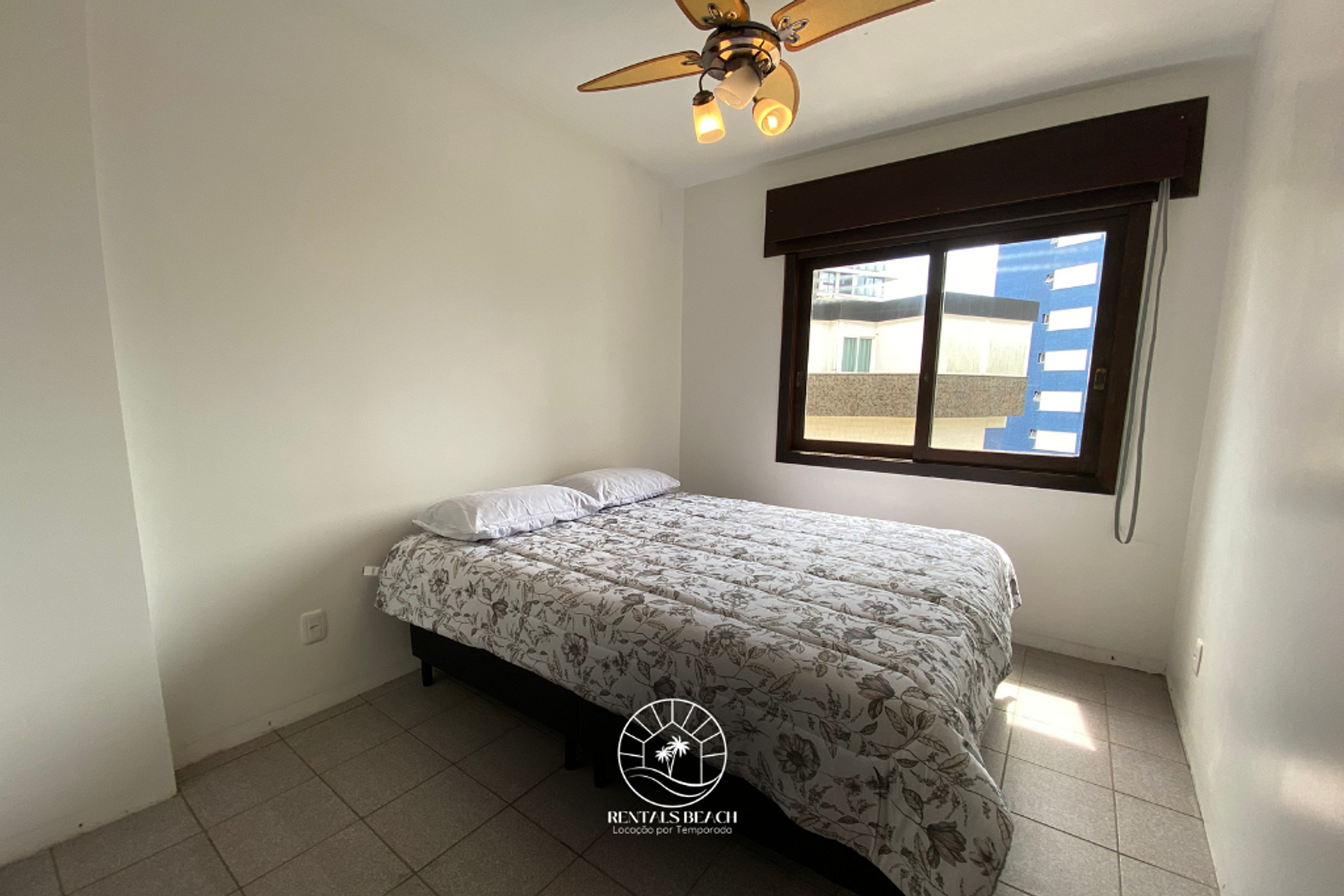 Quarto 02: cama de casal padrão, ventilador de teto e cortina blackout.