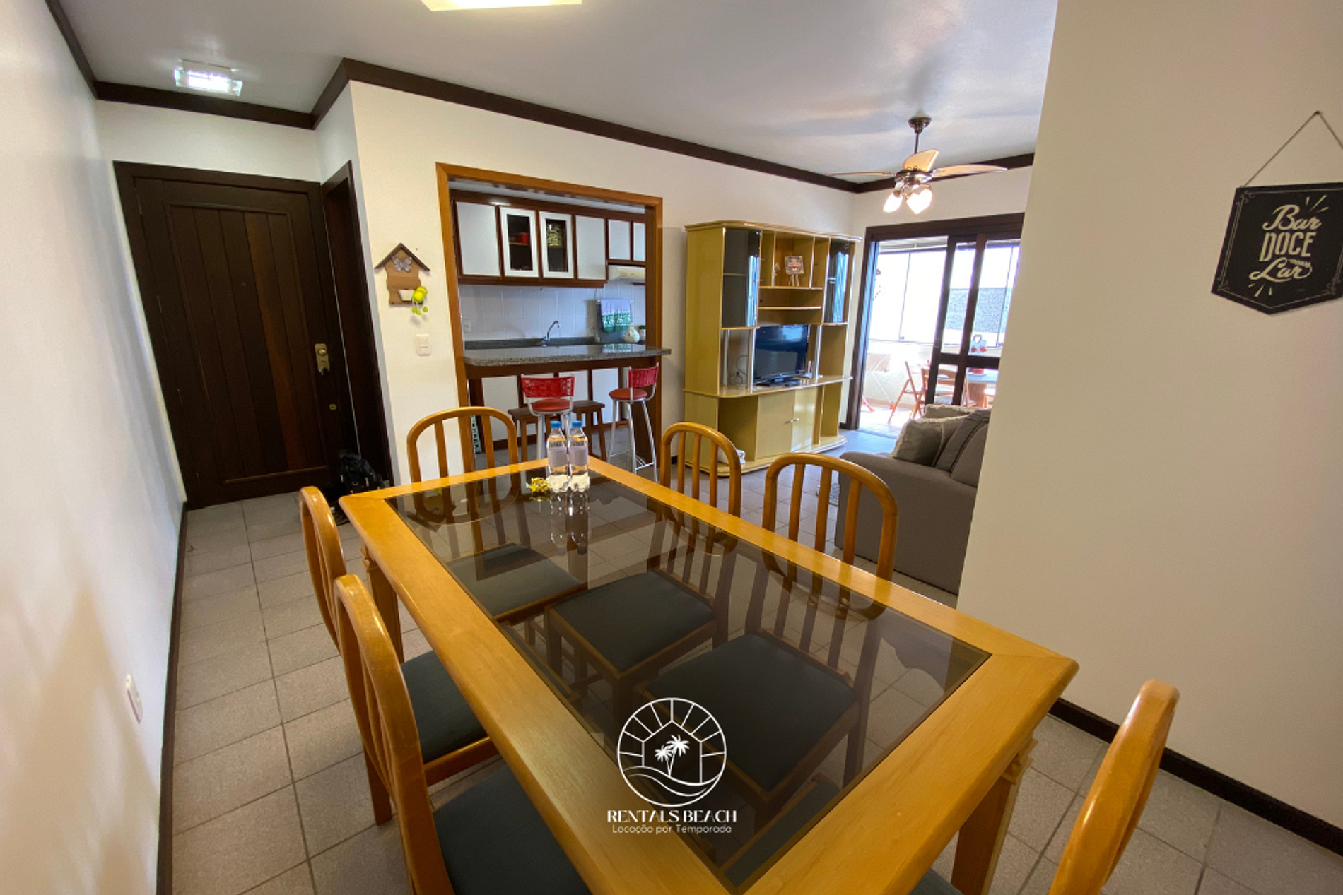 Sala: sofá cama, Smart TV, Wifi, ventilador de teto e mesa de jantar com 06 cadeiras.