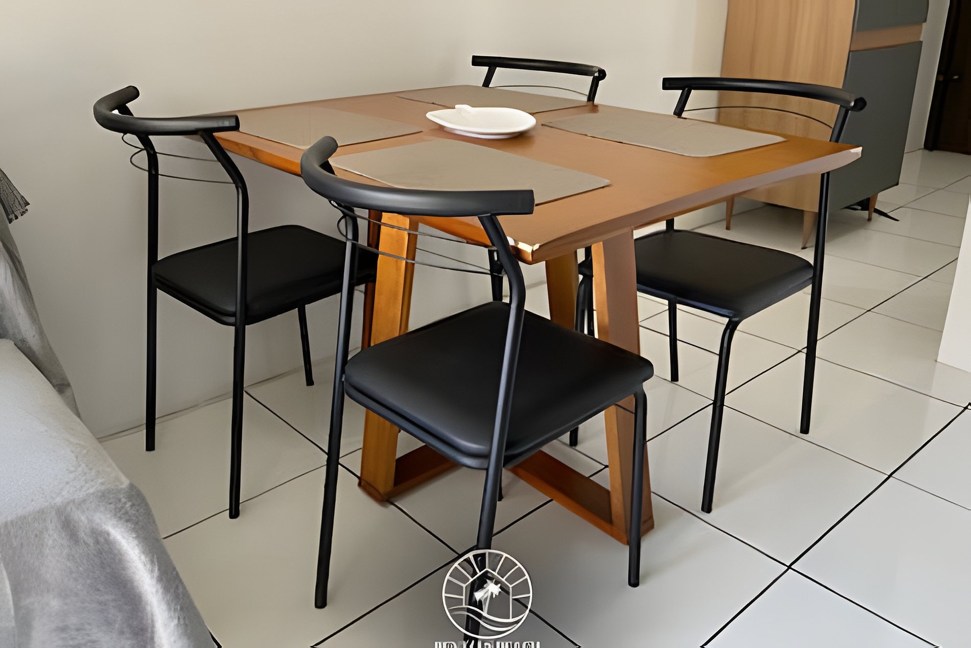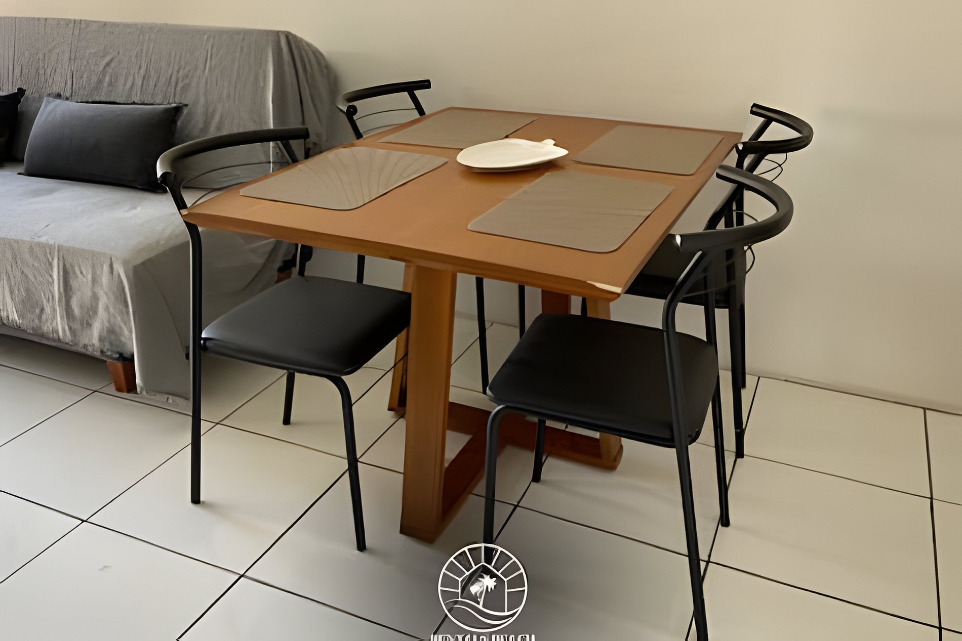 Sala: sofá cama, Smart TV, Wifi, ventilador de teto, mesa de jantar com 04 cadeiras, varanda e persianas de madeira.