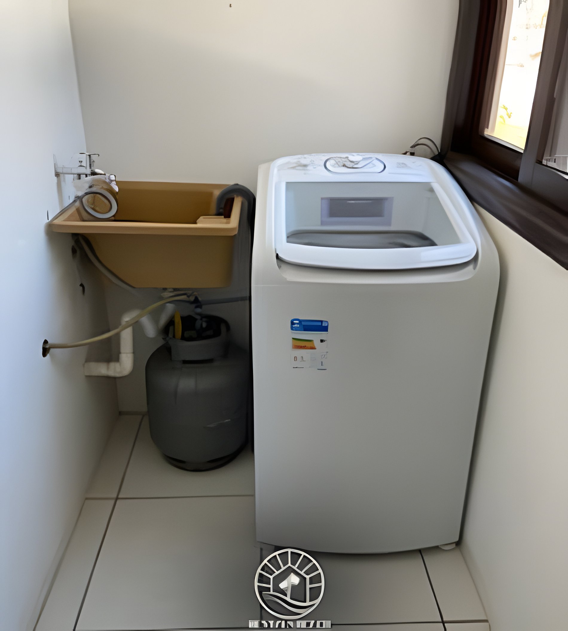 Cozinha: fogão 4 bocas, geladeira, forno, micro-ondas, chaleira elétrica, liquidificador, cafeteira, sanduicheira, utensílios, máquina de lavar roupas e varal.