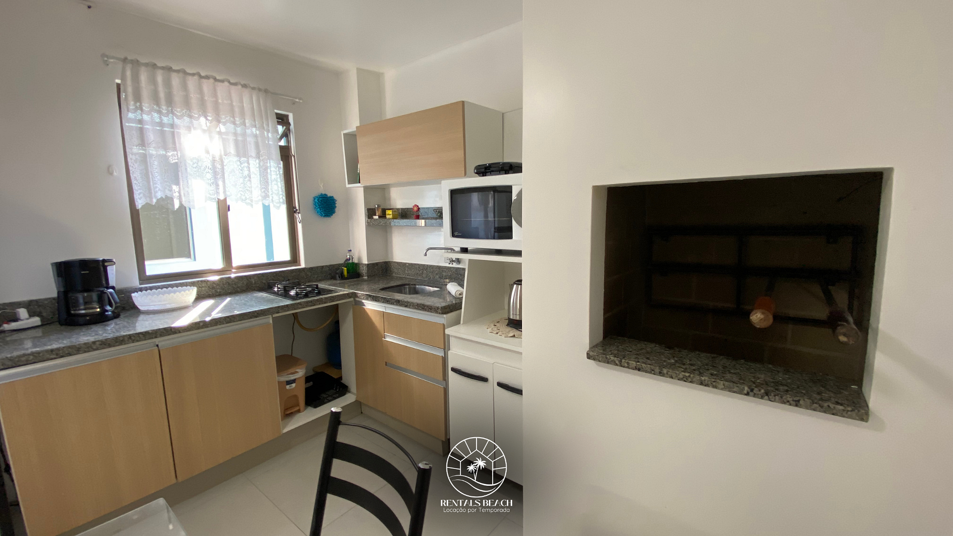 Cozinha: fogão 02 bocas, geladeira, forno, chaleira elétrica, liquidificador, cafeteira, sanduicheira, churrasqueira, mesa, cadeiras, TV e utensílios.