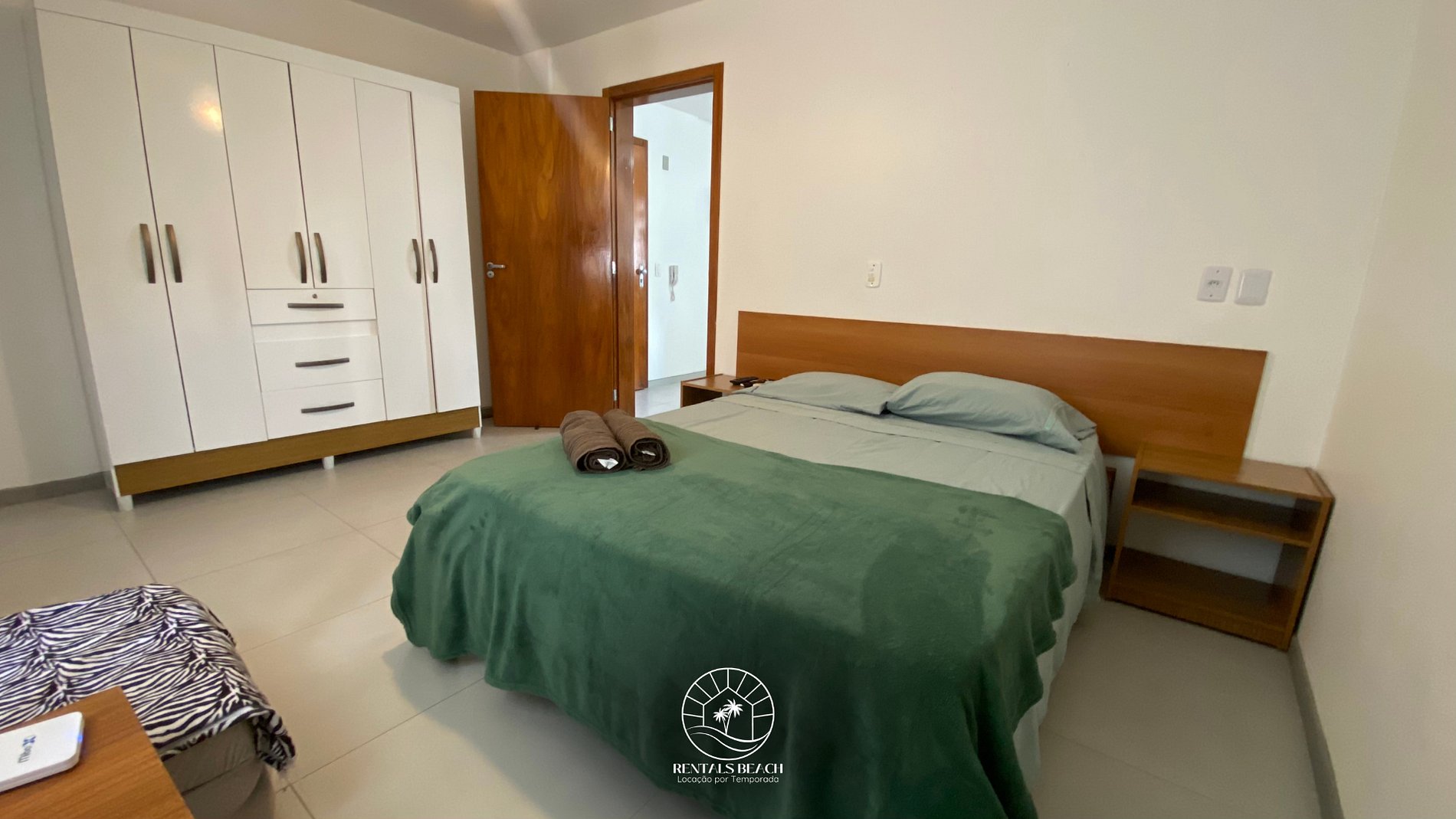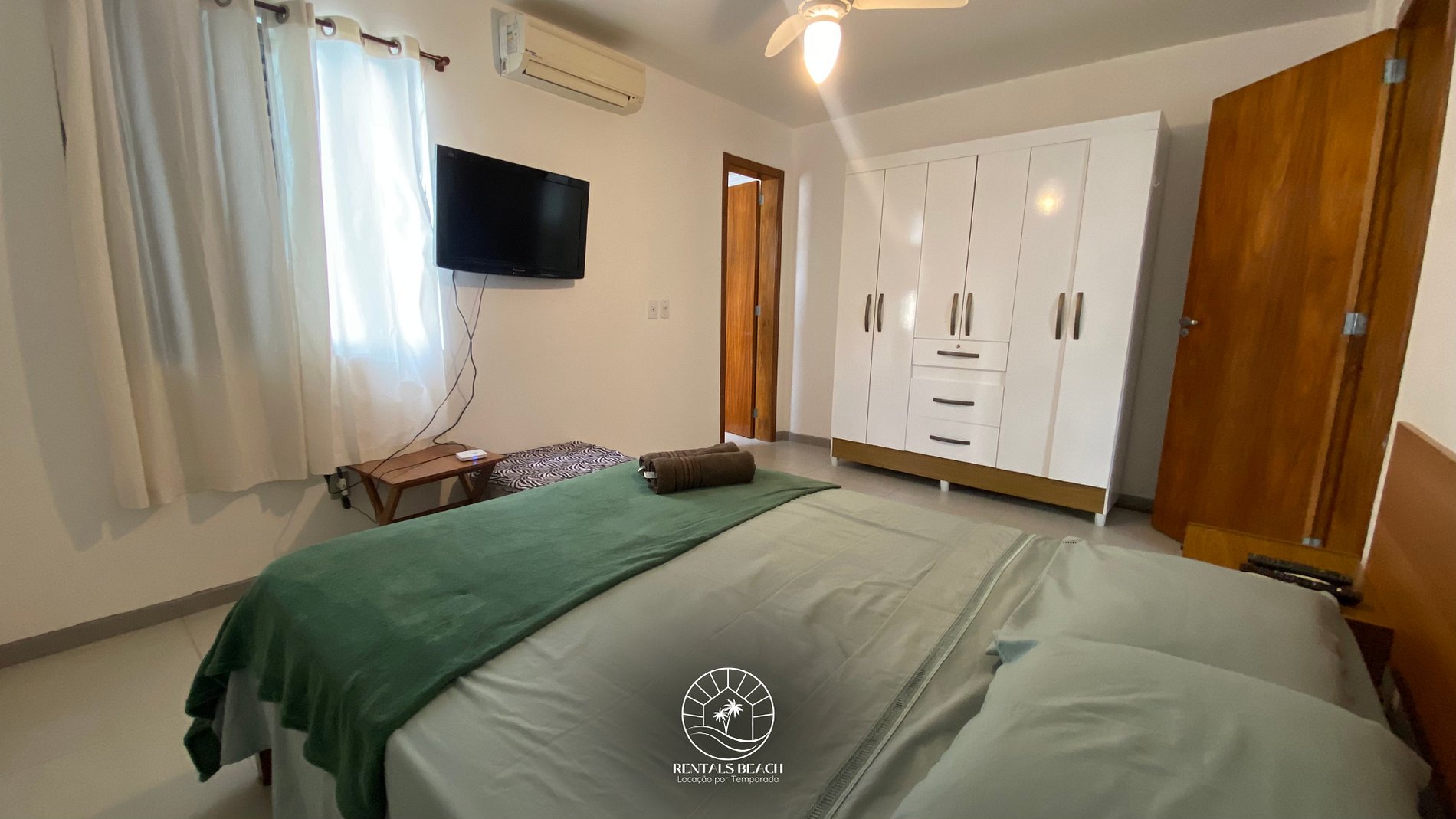 Quarto principal: cama de casal, ar-condicionado, Tv com canais, armário fechado com cabides e banheiro privativo.