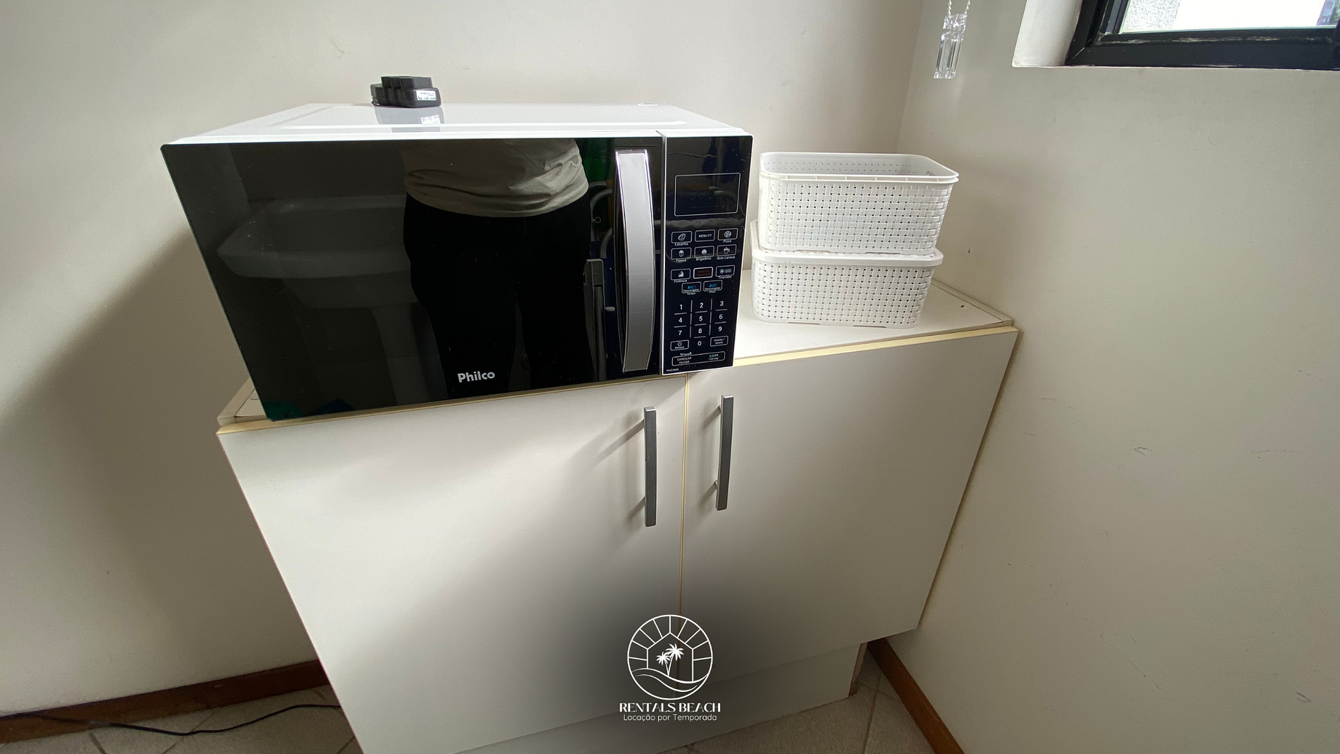 Cozinha: fogão 4 bocas, geladeira, forno, micro-ondas, liquidificador, cafeteira, sanduicheira, utensílios, tanque para lavar roupas.