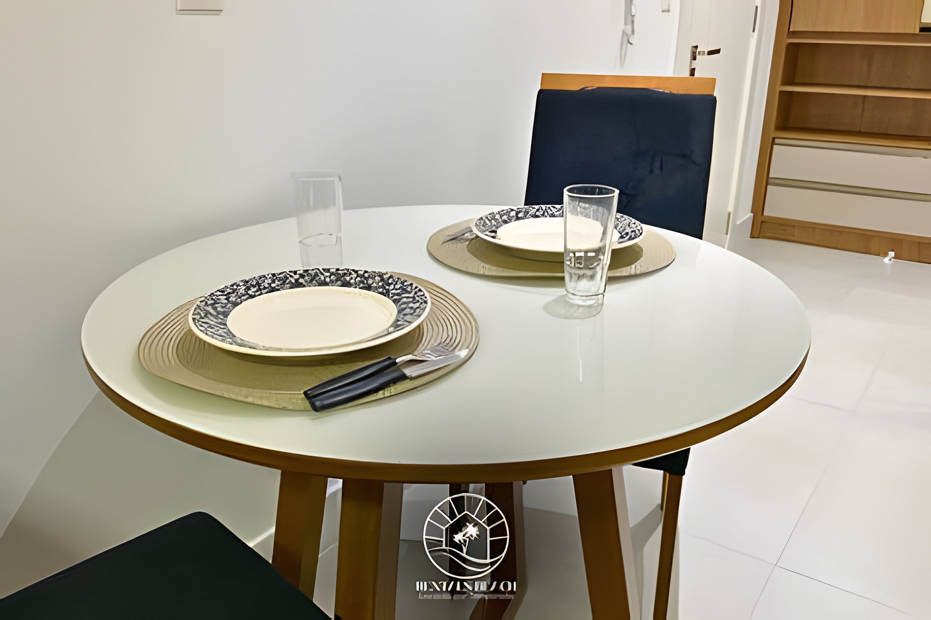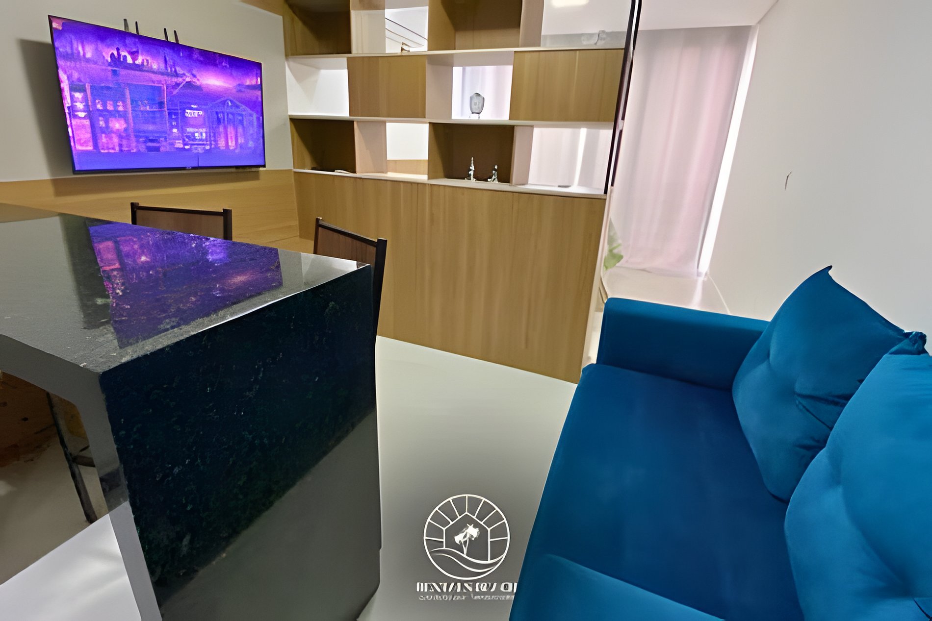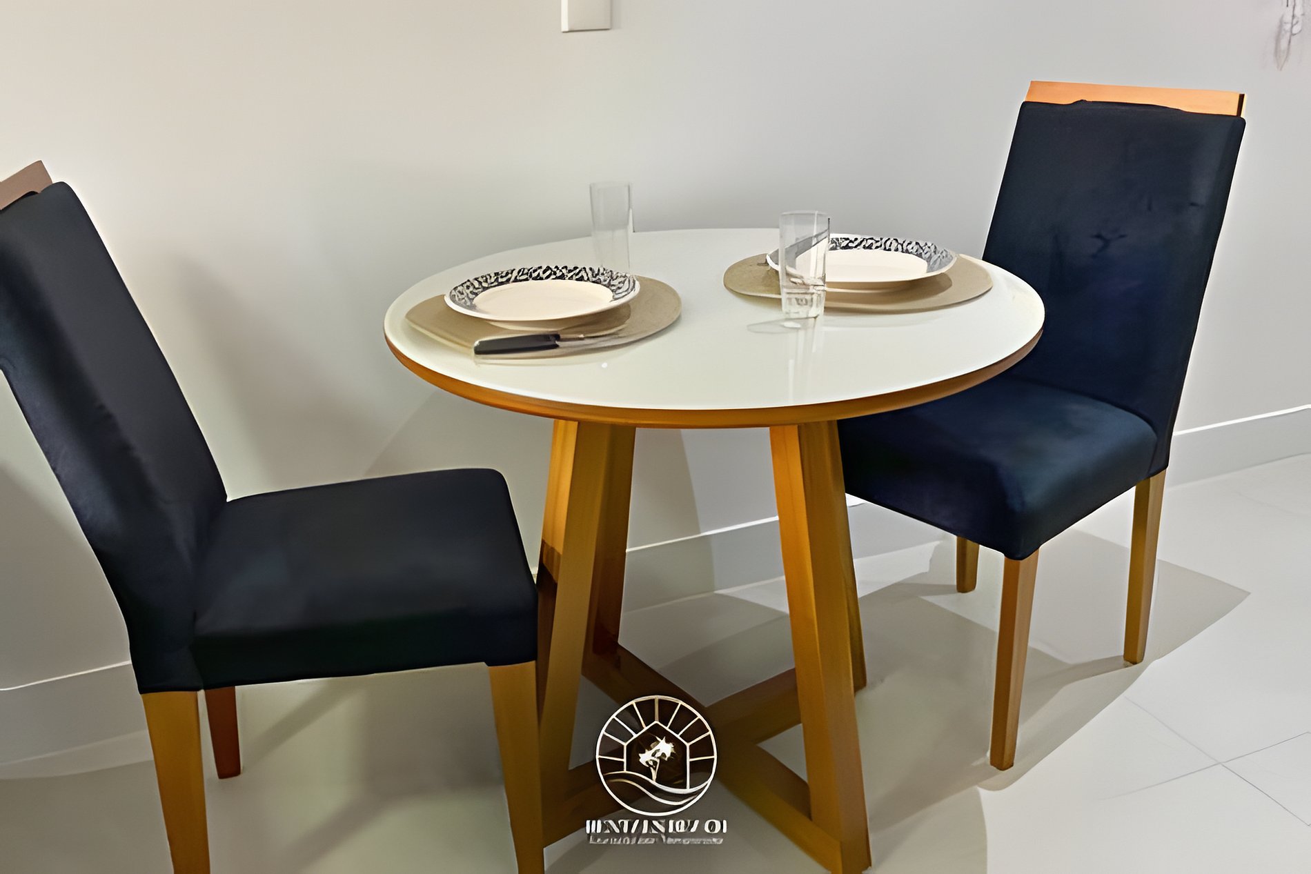 Sala: sofá cama, Smart TV, Wifi, bancada com cadeiras altas, mesa de jantar com cadeiras.