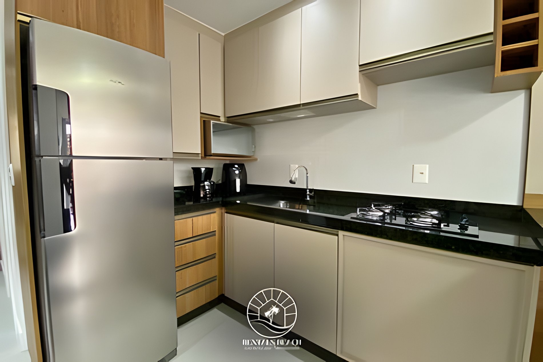 Cozinha: fogão 4 bocas, geladeira, micro-ondas, chaleira elétrica, liquidificador, air fryer, sanduicheira e utensílios.