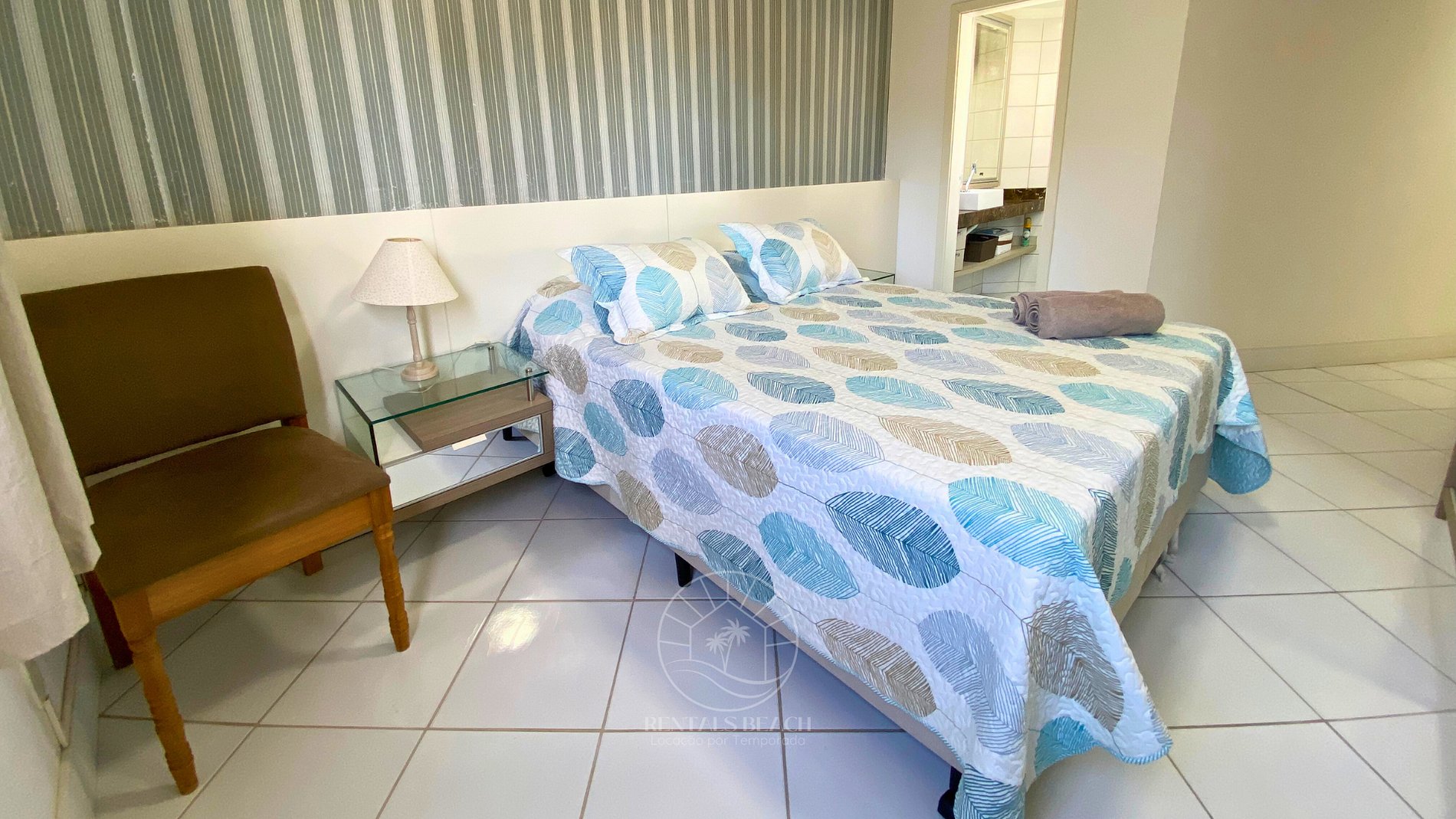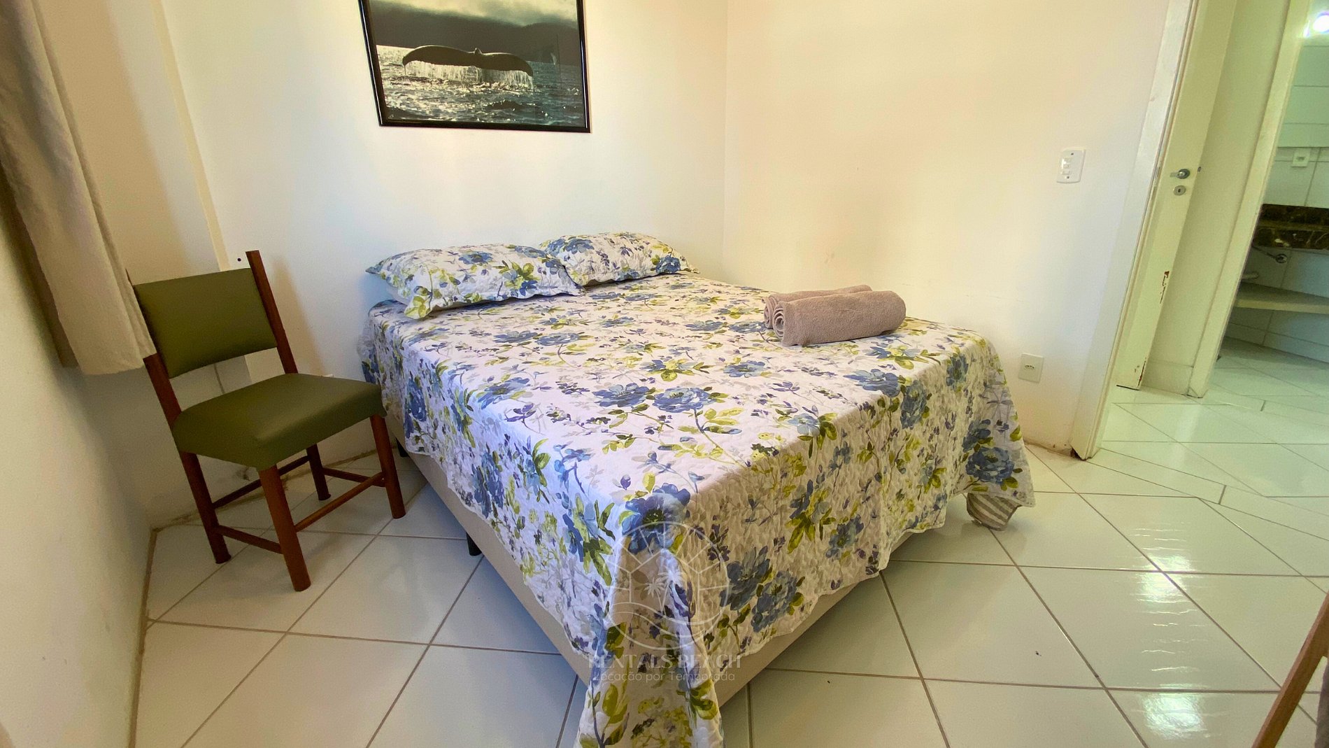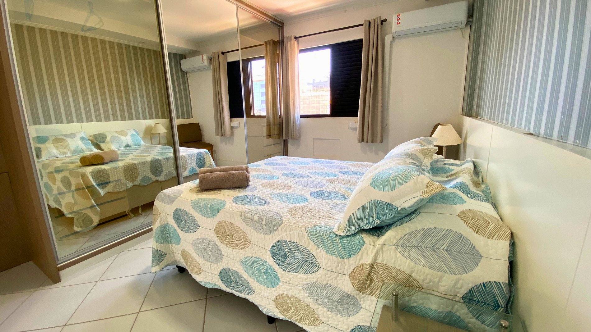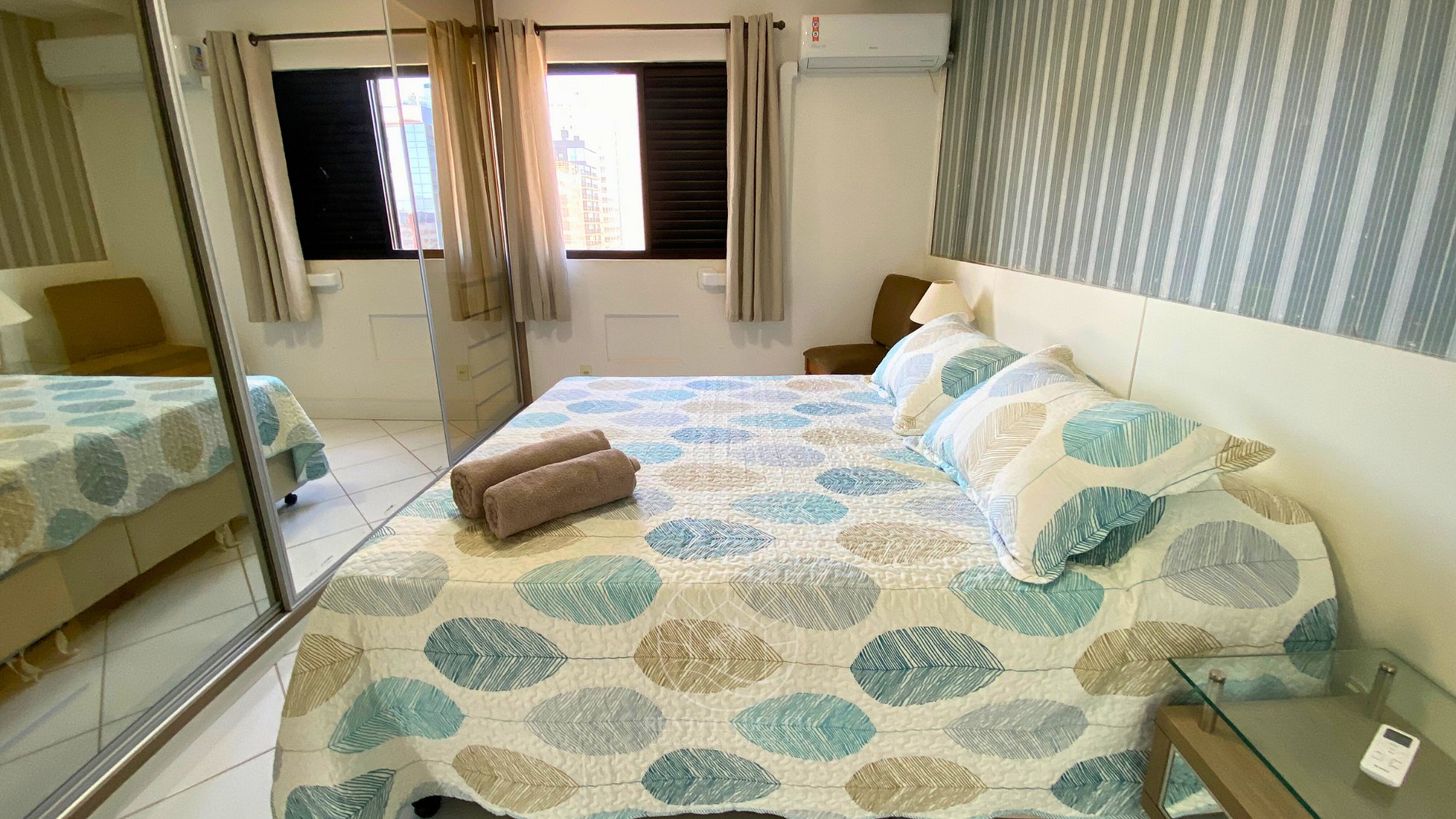 Suíte: cama de queen, ar-condicionado, armário fechado com cabides, espelho, banheiro privativo (chuveiro elétrico) e veneziana e cortina translúcida.