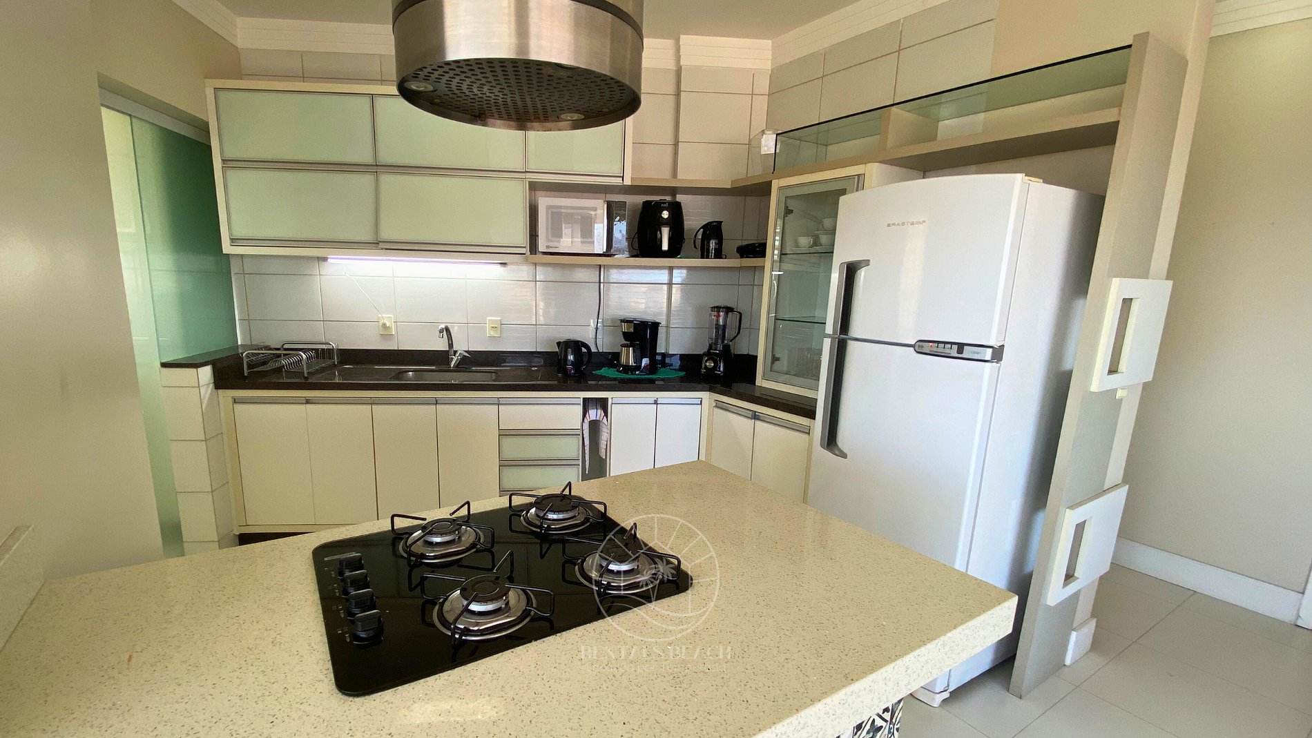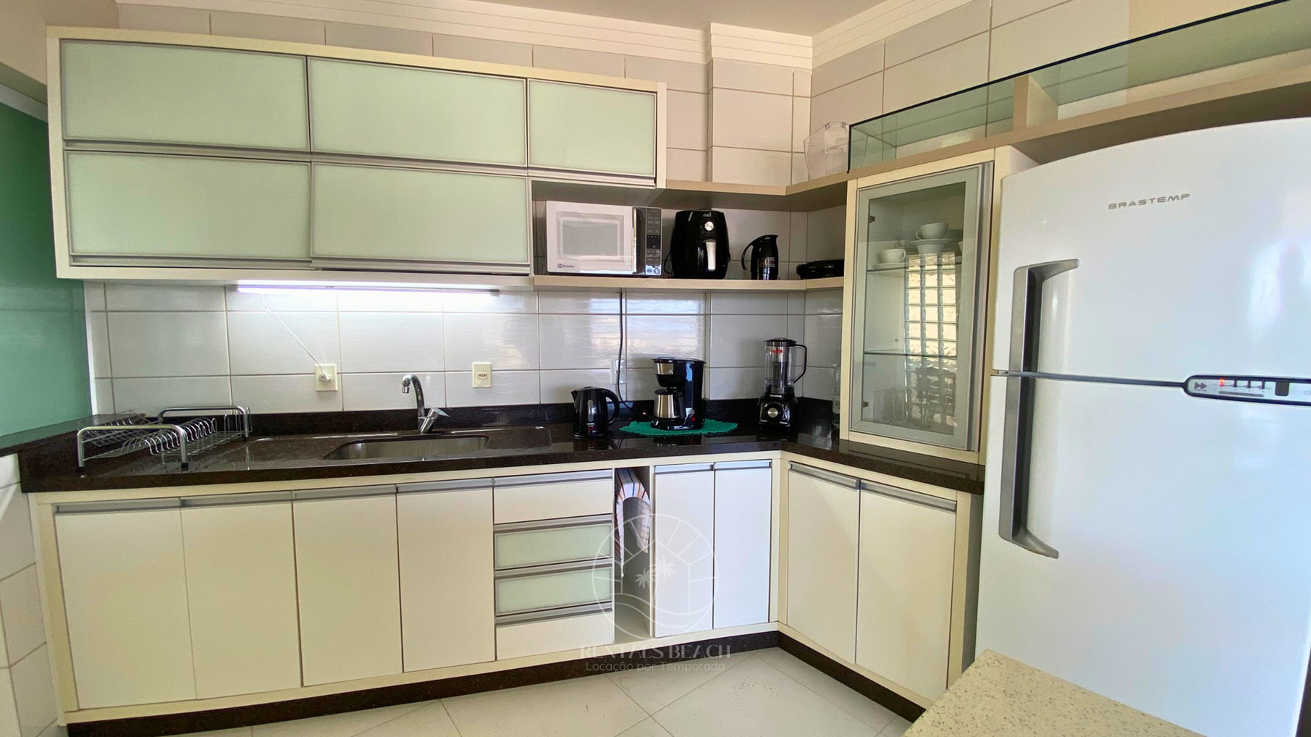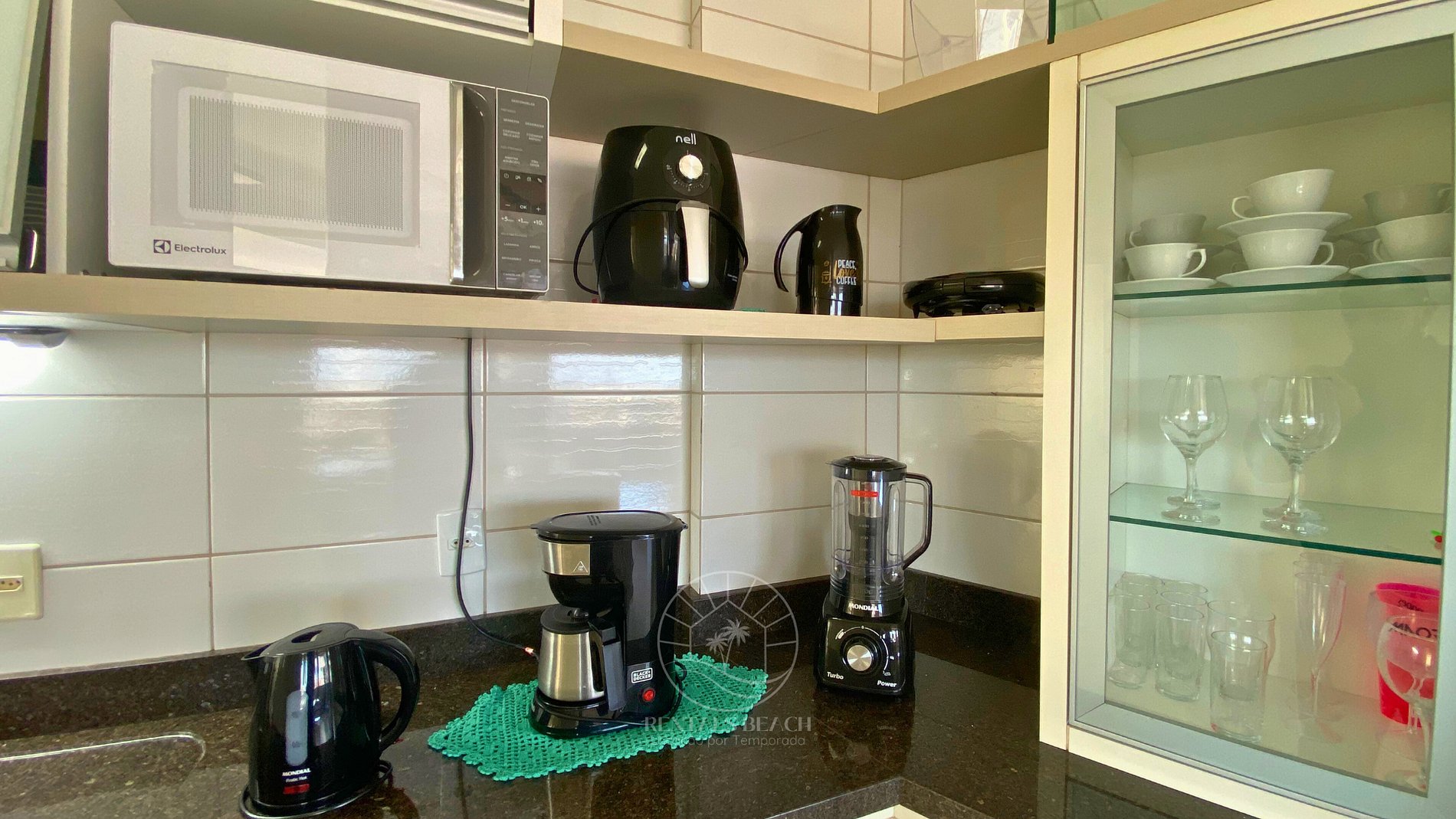 Cozinha: fogão 4 bocas, geladeira, forno, micro-ondas, chaleira elétrica, liquidificador, cafeteira, sanduicheira, utensílios, máquina de lavar roupas – lava e seca.