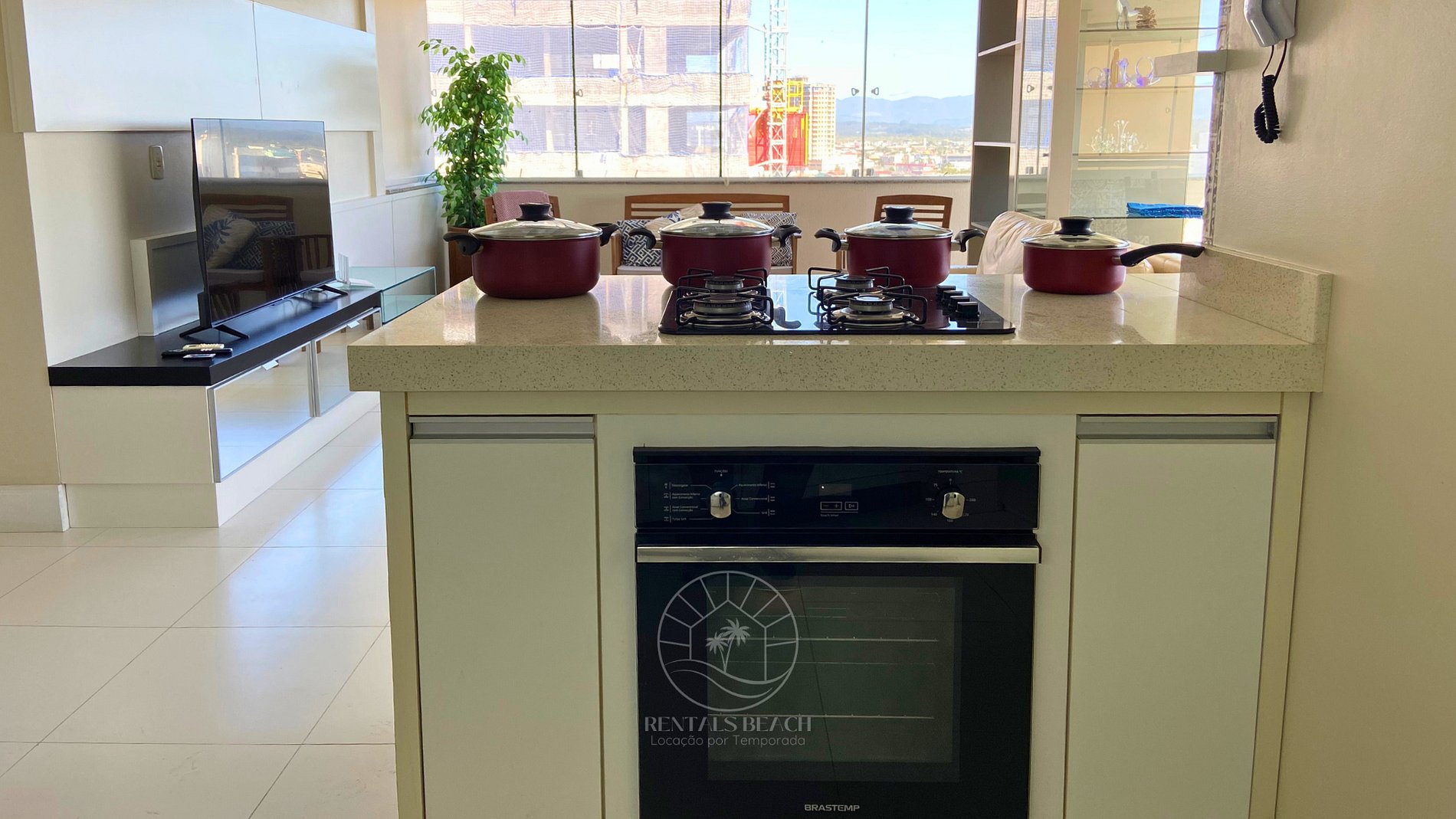 Cozinha: fogão 4 bocas, geladeira, forno, micro-ondas, chaleira elétrica, liquidificador, cafeteira, sanduicheira, utensílios, máquina de lavar roupas – lava e seca.